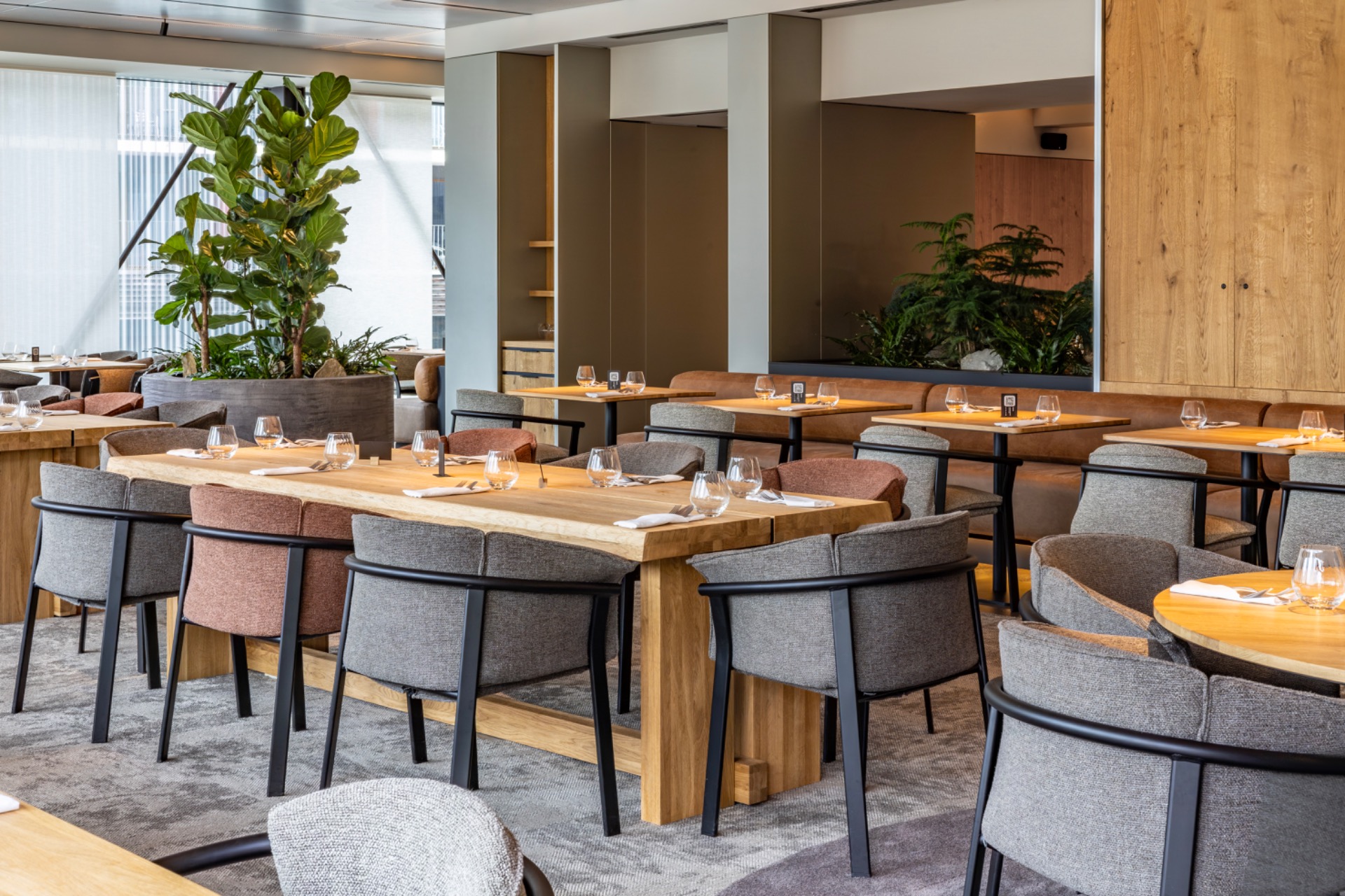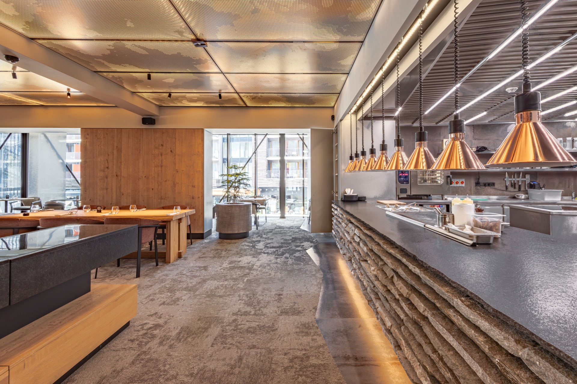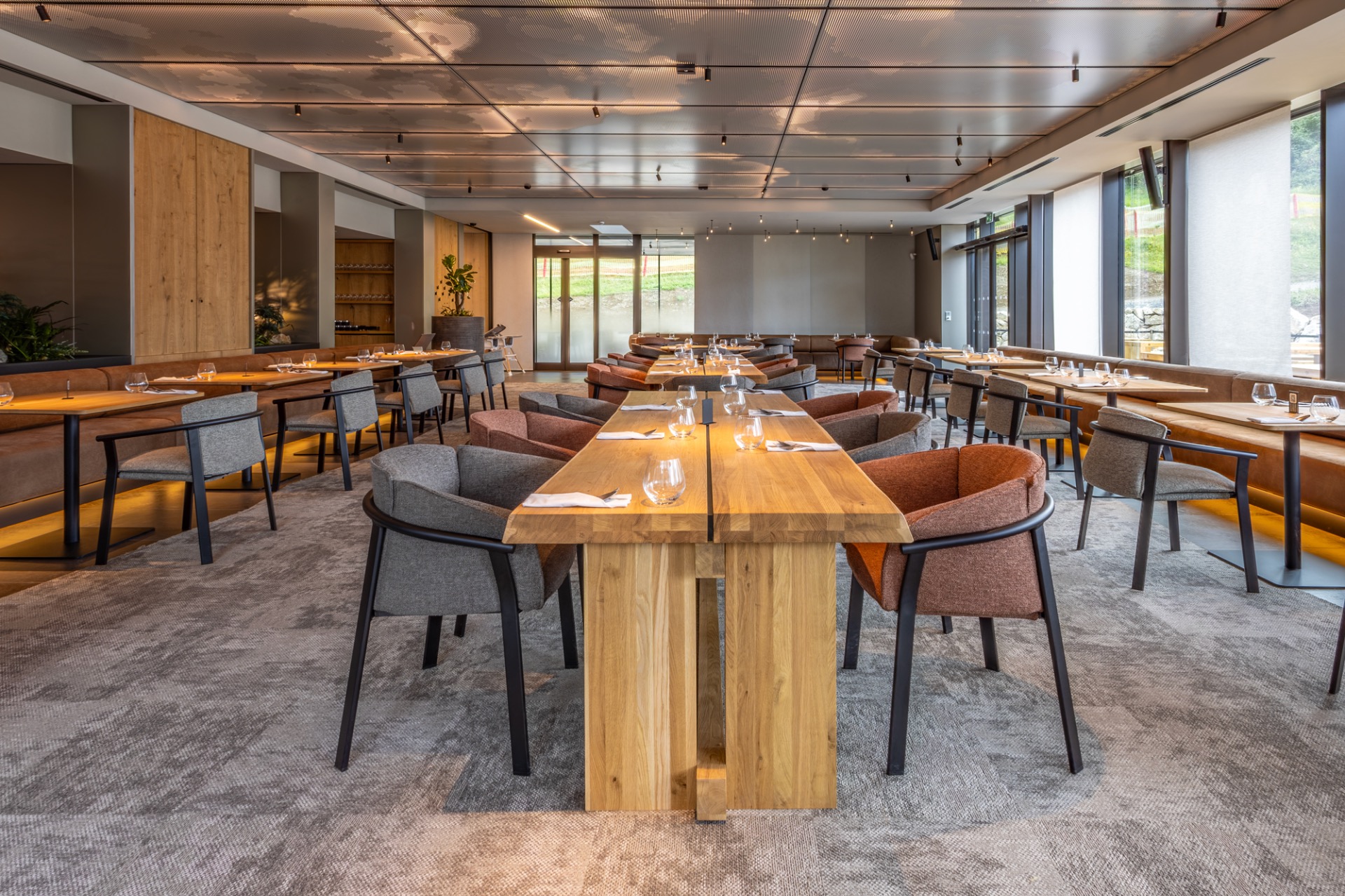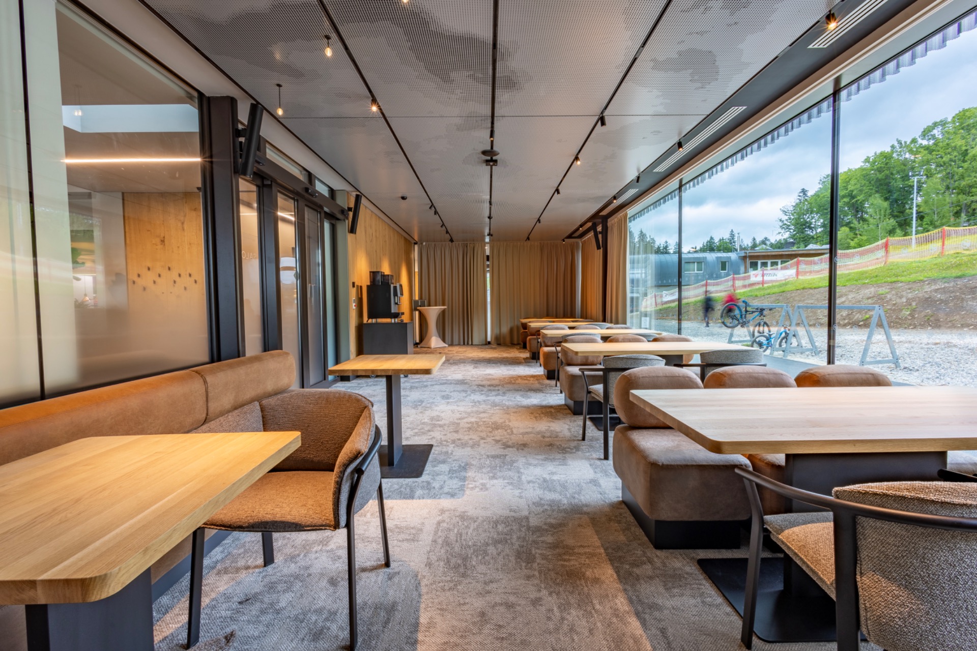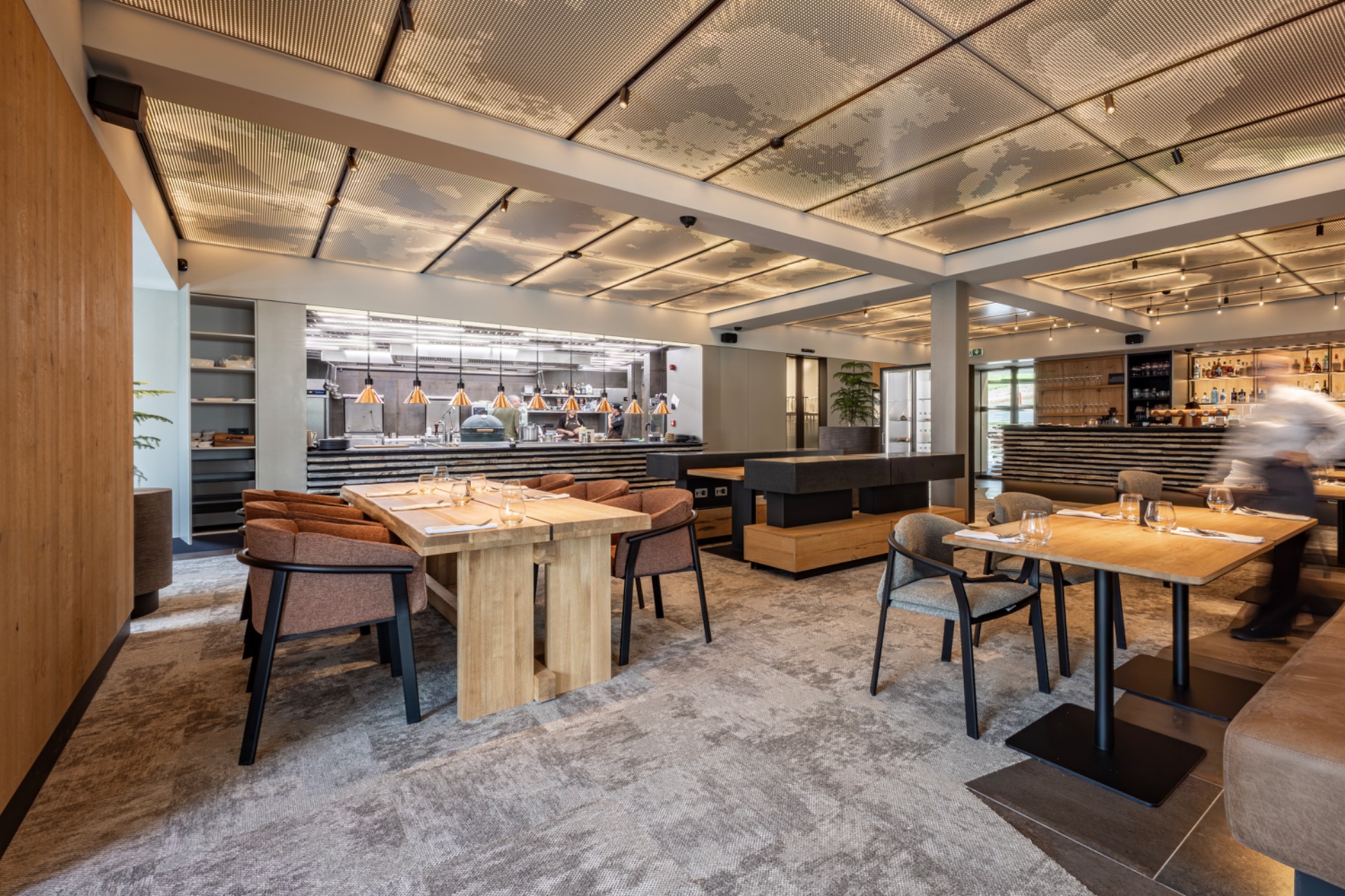 Restaurace je oddělena od salonku — menší akce tak mohou probíhat nerušeně, bez hluku z hlavního provozu. V salonku je profesionální audiosystém postavený na technologii Dante s digitálními aktivními mikrofony. Zapnutí mikrofonu na ovládacím panelu automaticky spustí i projekční plátno a projektor. Připojit notebook lze bezdrátově přes HDMI — z libovolného místa v místnosti.
