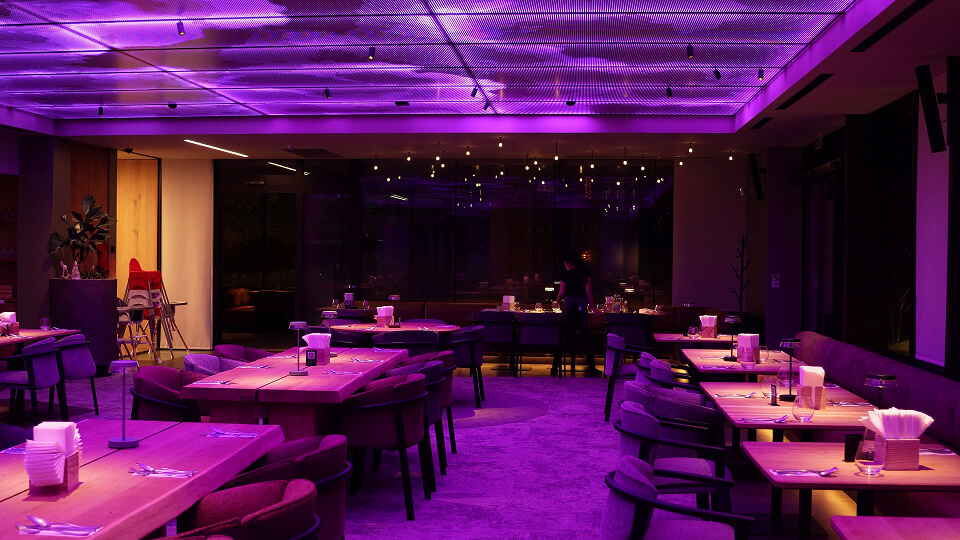 Restaurace má celobarevné podsvětlení stropu. To není detail — to je dominanta celého prostoru. Systém umožňuje nastavit libovolnou barvu nebo přepínat mezi přednastavenými scénáři. Romantická večeře? Firemní akce? Dětská oslava? Jeden dotyk na ovládacím panelu.